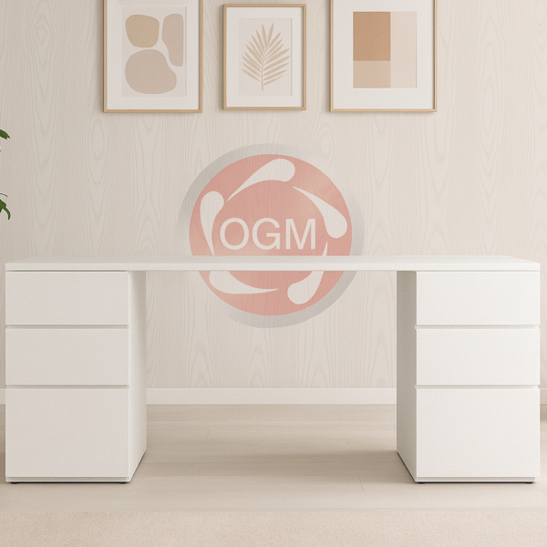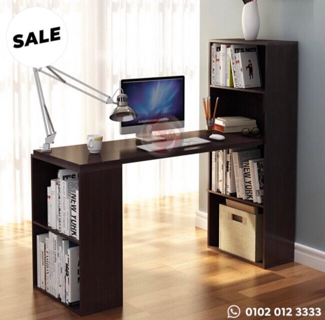 مكتب عملي بتصميم عصري يحتوي على رفوف جانبية لتخزين الكتب والملفات، مثالي للمساحات الصغيرة والمكاتب المنزلية. خامات عالية الجودة وتشطيب أنيق.